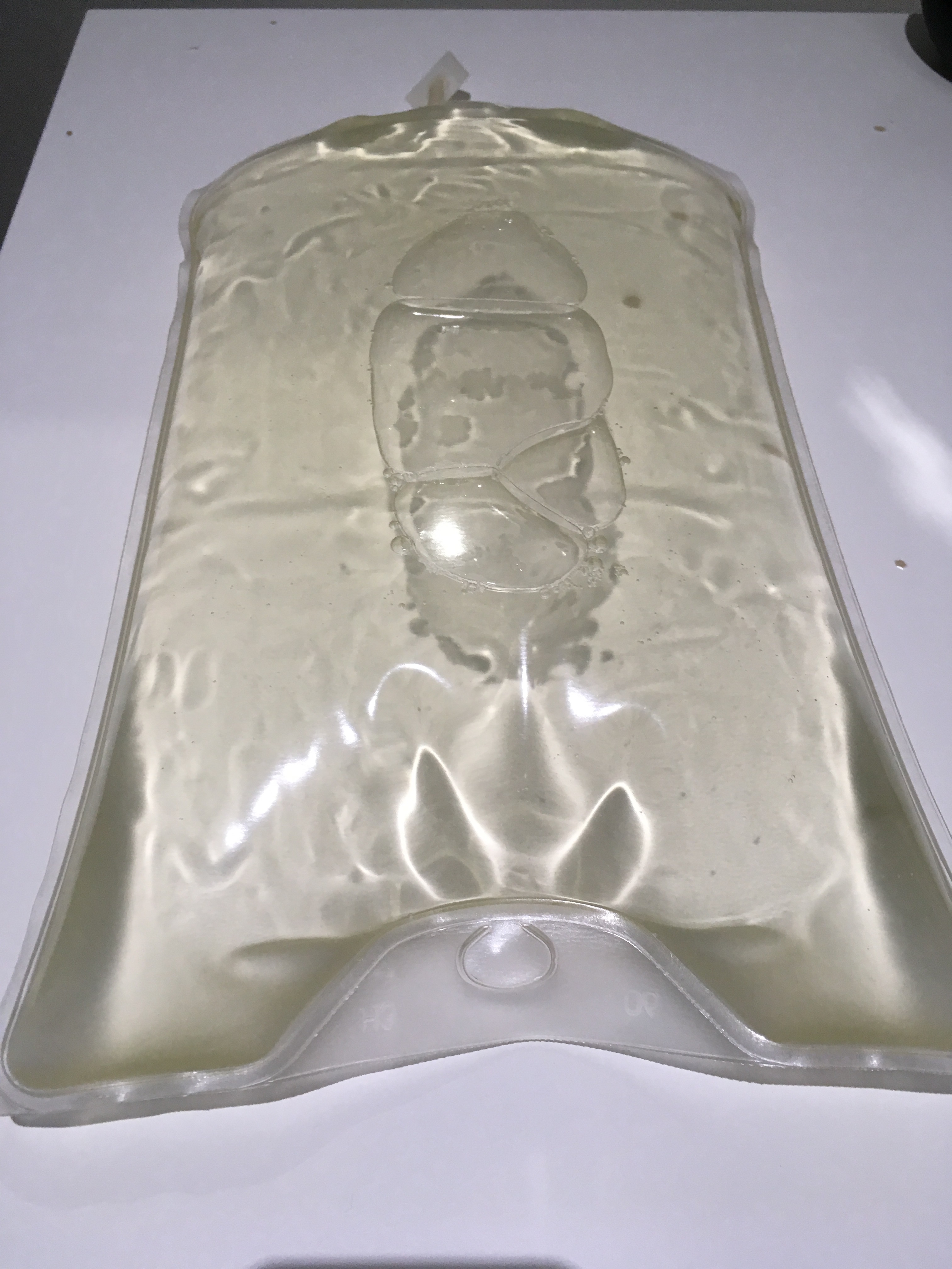 Anyway, I just drained out 2380 mL at noon and the drain bag was pretty full. Abdomen is still sore from carrying all that fluid around for six hours.