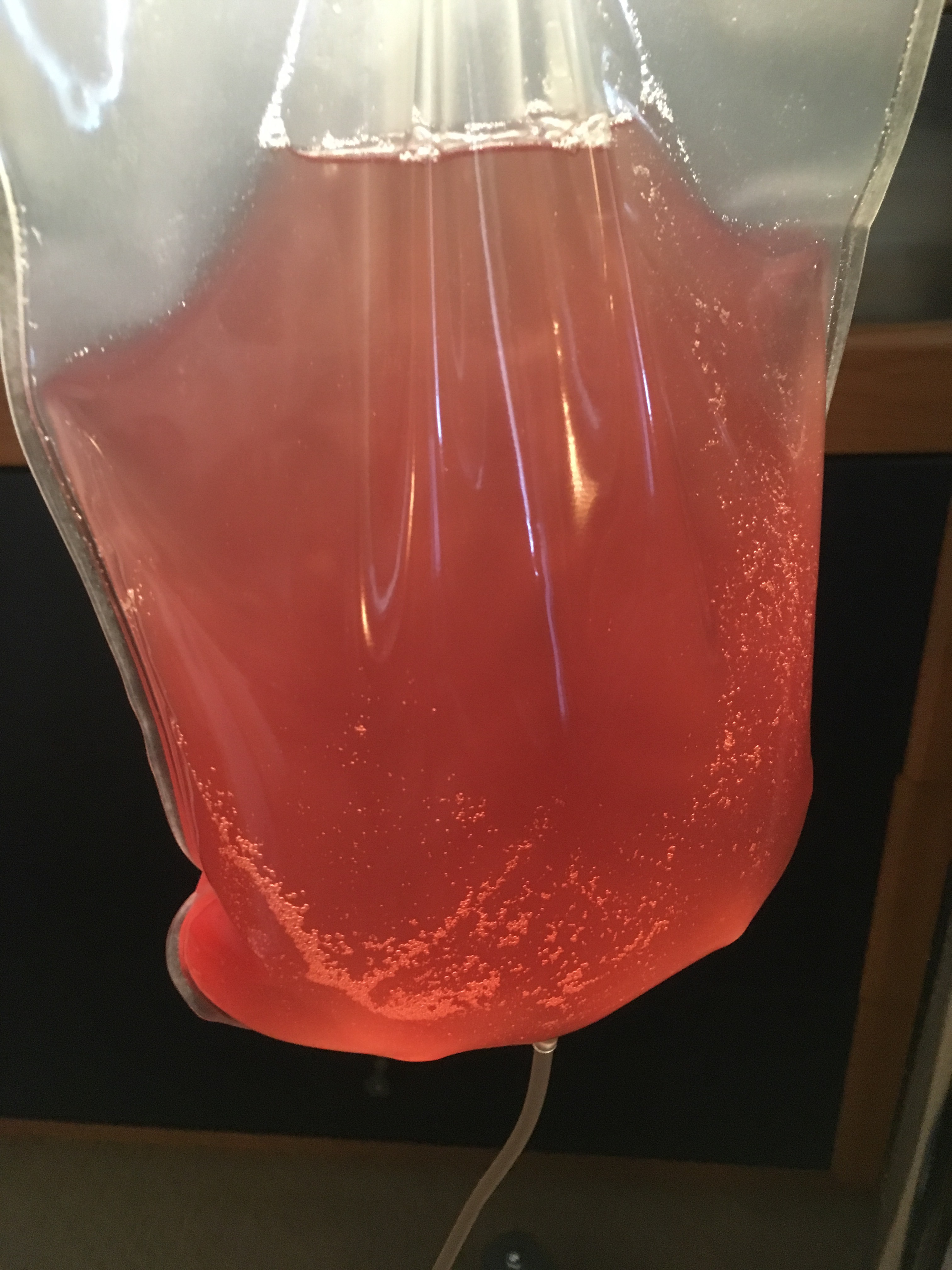 The midday drain was pink again; I think it’s darker than last time. It was a very difficult night last night. I woke up many times feeling full and even threw up once. Maybe it’s related to the internal bleeding.