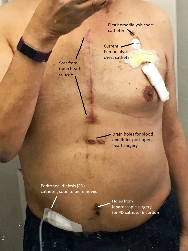 Less than three years ago, I didn’t have any scars on my chest. After 30 months of dialysis and open heart surgery, my upper body is now a huge mess. If we do put in a fistula for hemodialysis, then there will be another surgery on my (probably left) arm. Finally, if I ever get a kidney transplant, there will be another large scar on the side of the pelvis.