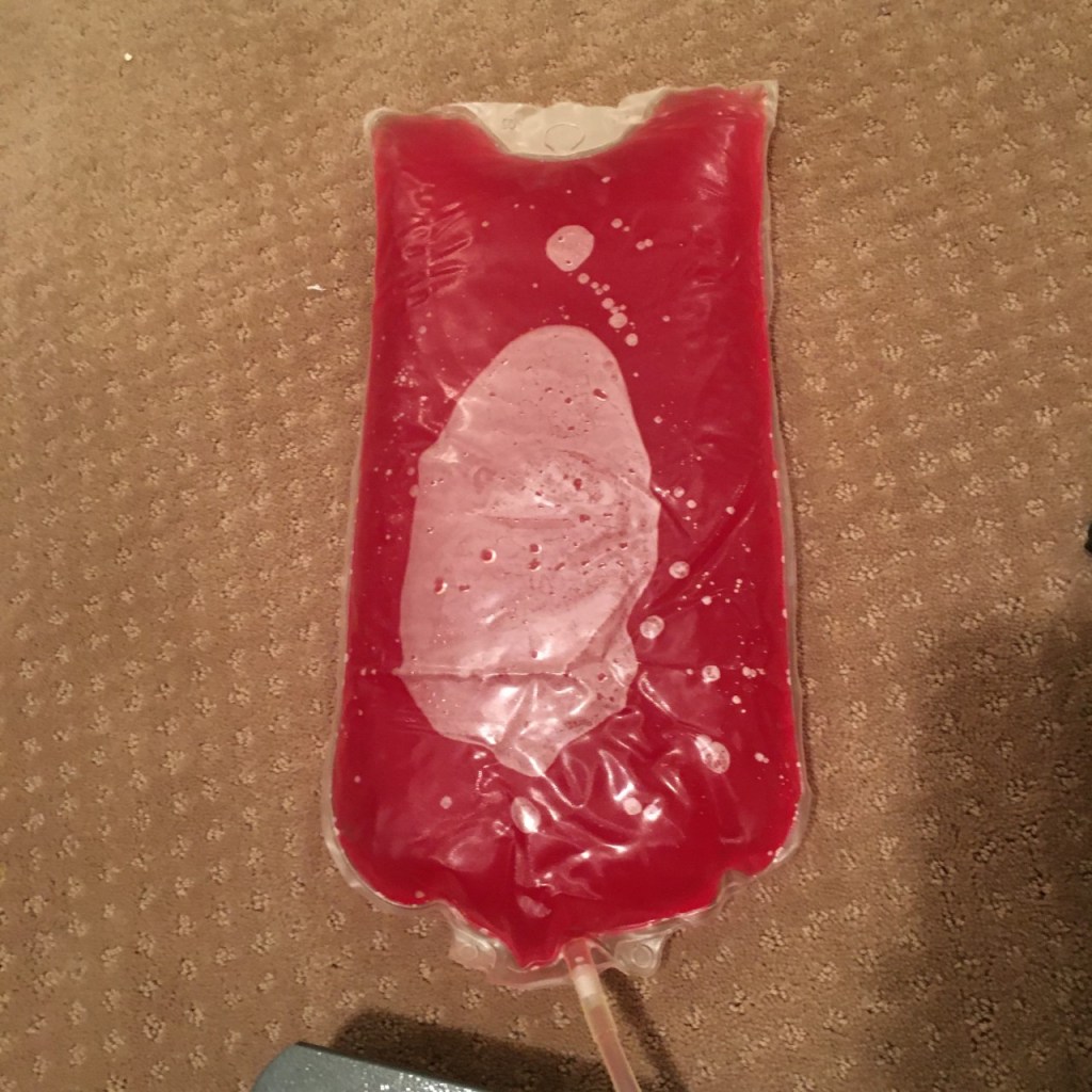 Since I still have the unused peritoneal catheter, I’m flushing it every few days. I used a manual exchange bag with 2500 mL of 2.5% dextrose solution split into two fills/drains of ~1250 mL. When I first did the initial drain, I noticed that the fluid was super red, like it was 100% blood. I took a photo of the first drain: