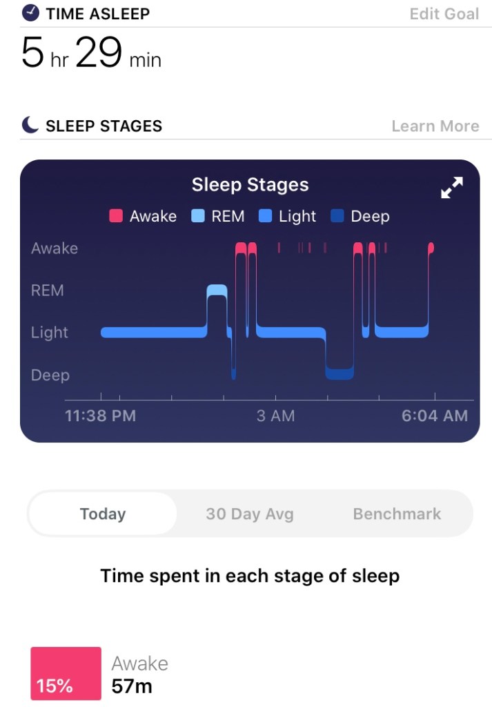 For today, I went to sleep around 11:38 pm and woke up at 6:04 am. That should be ~6.5 hours but Fitbit said I was awake for 57 minutes during that period. I do remember being up just before 4:00 am so maybe it’s accurate. Out of that time though, there was very little REM or deep sleep so even though I just woke up, I still feel a bit tired. I think my room is still too hot so I’m going to try turning off the space heater tonight to see if it improves my sleep time.