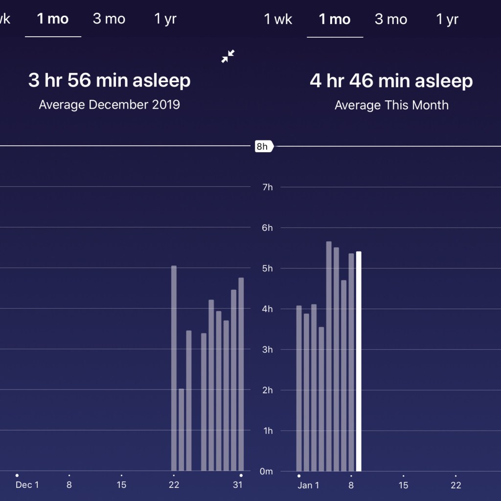 Above is the sleep record from Fitbit. Not sure how accurate is it since I think there are short naps that were ignored. Anyway, there’s definitely an improvement over time from about four hours per night to five hours this week. My sister gave me the more advanced tracker on December 22; I was using just the very basic Fitbit tracker before.