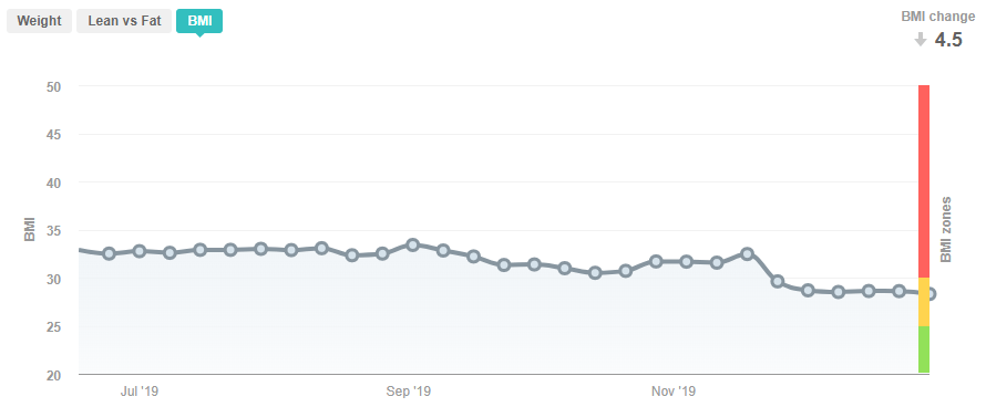 BMI history from Fitbit. Since I was weighing myself on the wireless scale daily while on peritoneal dialysis, there is a lot of data. The big drop was actually in December when they got rid of excess fluid from the surgery by taking out a lot of fluid during dialysis each day. On November 10th, I was still ~230 lbs and even after surgery, on November 24th, I was still around the same weight. By December 3rd I was down to ~220 lbs and then ~210 lbs by December 6th. I think there was an extra dialysis day during that time, and I was pulling out extra fluid with the remaining PD solution. A week later, I was around ~205 lbs and it has remained between 201 to 206 lbs on the scale, depending on the dialysis cycle and what I’m wearing at weigh-in.
