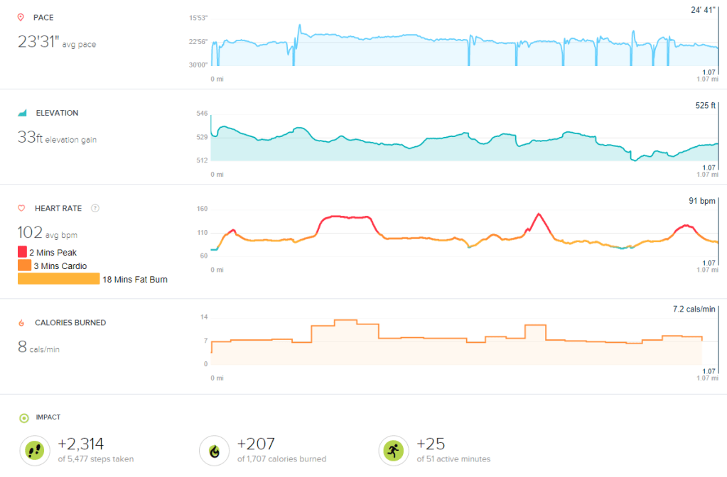 I walked 1.07 miles at a pace of 23’31”. I was by myself so the pace was a bit faster. I noticed that the GPS didn’t kick in on the last walk. I think I started the tracker in the garage where the GPS signal was weak. This time waited until I was out on the driveway before starting the tracker and it worked fine.