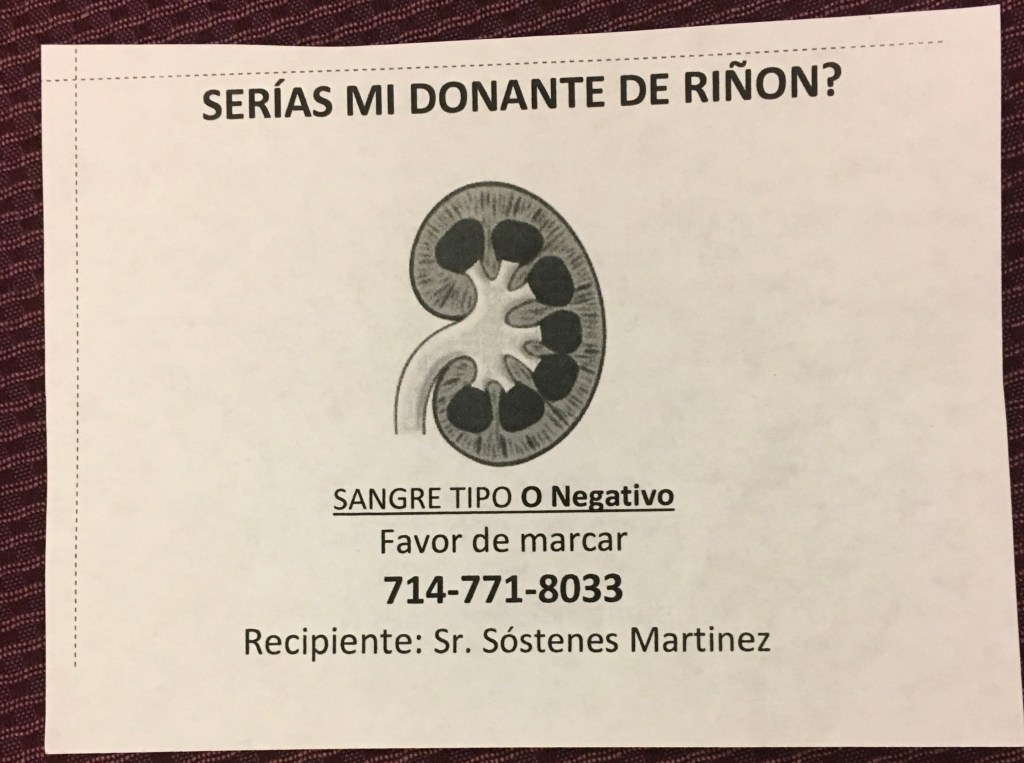 I think the top part says “Would you be my kidney donor?” in Spanish. He’s looking for a O negative kidney. I wonder how long he has been on dialysis, if at all.