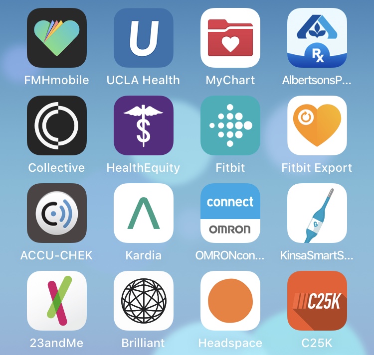 I now have a full page of medical related apps on my phone: Follow My Health, UCLA Health (transplant), pharmacy, health insurance, FSA, Fitbit, Accu-Chek, Omron, Kardia, Kinsa (thermometer), 23andMe, etc.
