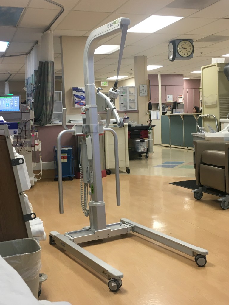 We have a patient lift at the dialysis clinic. It’s new and quite fancy. It will weigh the patient while lifting them out of the wheelchair. There was an old one previously but they replaced it recently. The patient basically sit in a big canvas or cloth bag and the device lifts them from their wheelchair to the dialysis chair and vice versa.