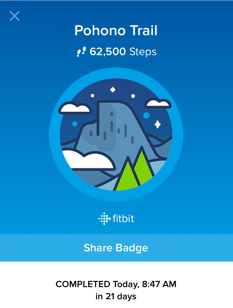 I finally finished the third and last solo virtual trail in Fitbit. Pohono Trail is another hiking trail at Yosemite and it had 62,500 steps. This seems to be a fairly difficult trail covering ~13 miles one way and with 2,800 feet of elevation change. Embarrassingly, it took me 21 days to complete since I had stopped walking daily due to the recent surgery.