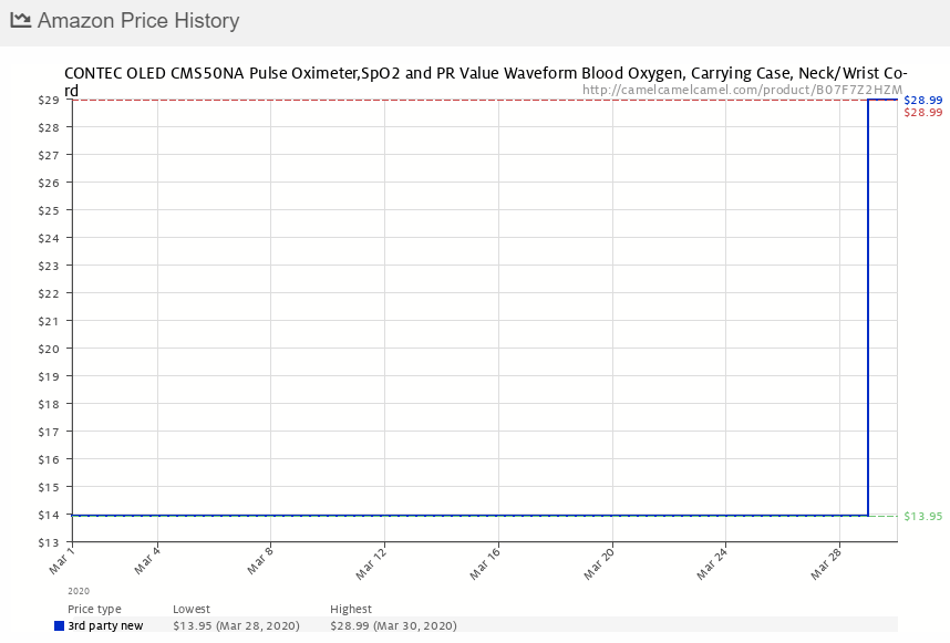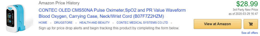Since I’m a bit short of breath lying down, I thought I could get a oxygen saturation sensor to see if there’s enough oxygen in my blood. I know they make portable ones since my primary doctor uses one when I go to her office. The first place I looked is Amazon and I checked price history on camelcamelcamel.com. This is another item that seems to have a thousand cheap Chinese copies but none of them are cheap anymore. Looking at price history of several items, they all seem to have doubled or tripled very recently. Several had their prices spike within the last day. How is that possible? Is it a bug/feature of the Amazon pricing model?