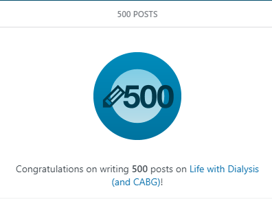WordPress tells me this is post #500 for this blog. When I started posting back in June of 2019, I was planning to do weekly posts, documenting the struggles I was having with peritoneal dialysis. However, with the heart bypass surgery in November and subsequent three months of recovery at home, I had lots of time to write and lots of stuff to complain about. I guess I got into the habit of communicating way too much online since there’s no one to talk to. Now it’s even worse with the COVID-19 quarantine. Previously, I was at least spending three days at work work co-workers and a few events weekly at church. Now I’m stuck at home and the only people I talk to are my parents and dialysis clinic staff.