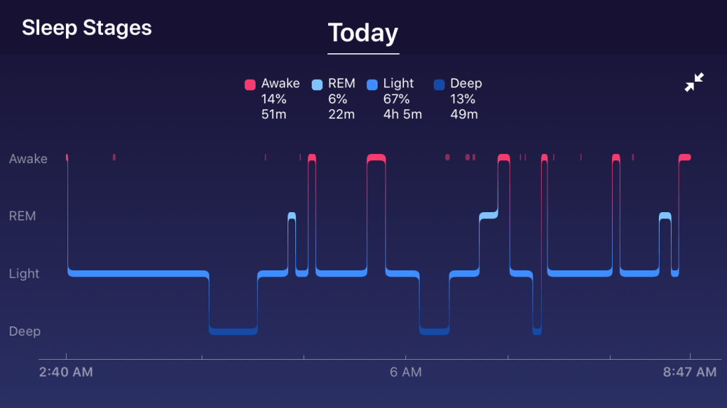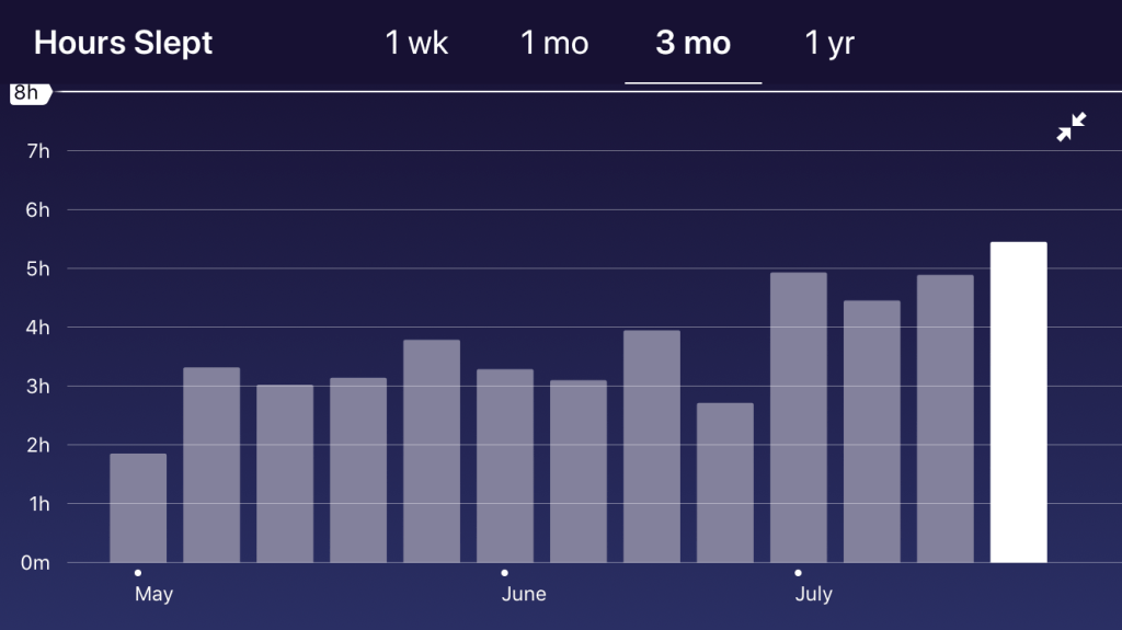 If you add up all the sleep times, this was about 5 hours and 16 minutes of sleep. Here is a longer trend:
