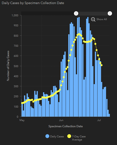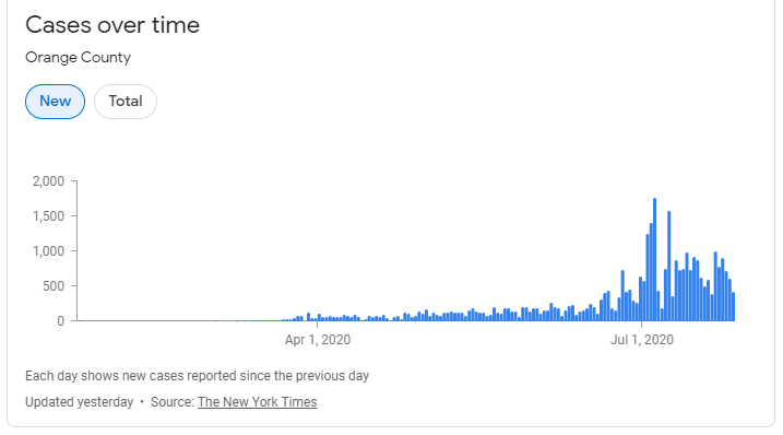 Here is a chart for number of cases in Orange County from The New York Times on Google. It looks somewhat different than the data shown by the Orange County Department of Health. I zoomed in to show May to July.