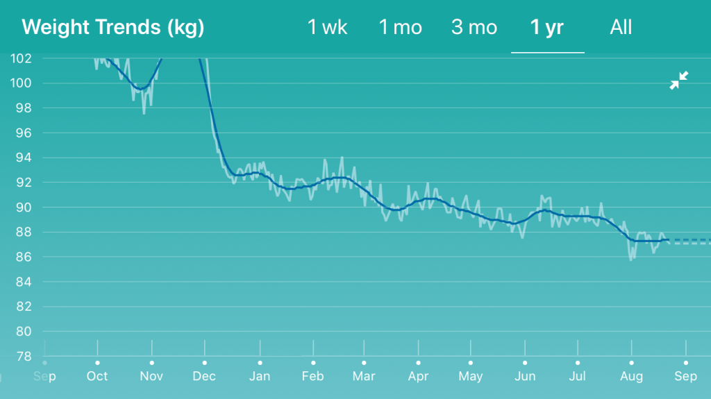 As I was brushing my teeth tonight before bed, the word thinner popped into my head. I know I’ve talked a lot about my weight loss. If this had been anytime within the last 30 years, I would have been very happy. However, I’m fluctuating between annoyed and concerned right now. I’ve kind of flattened out at ~88 kg lately but here’s the chart from Fitbit again, updated for today.
