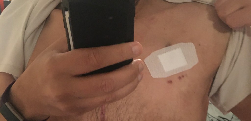 I made a post a few months ago detailing all the scars and catheters in my torso. With the removal of the chest catheter, I think there are no more holes in me. I still need to cover the exit wound for a few more days.