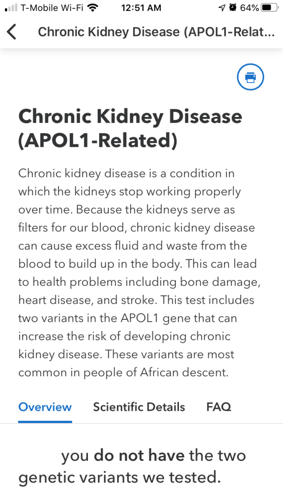Sigh, I know genetics is mainly statistical. Just because you do or do not have the gene variant has no predictive value on whether an individual will develop chronic kidney disease. I actually don’t know why they bother to tell their customers when it only affects populations. What if someone sees this and cancels their kidney health screening appointment? Maybe if you have these gene variants, you should be more diligent about your kidney health?