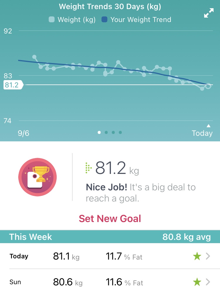 Many years ago, when I started weighing myself pretty consistently on the Fitbit Aria scale, the app asked me to put in a weight target. I arbitrarily set it at 81.2 kg. If you use 5’11” as my height, that weight would give me a BMI of 25.0. I know that the BMI is not a great measure of anything, but it’s used quite a lot. At the time, I probably weighed close to 110 kg so the goal seemed really far away. Since the surgery however, I’ve been losing a lot of weight and finally hit that goal: