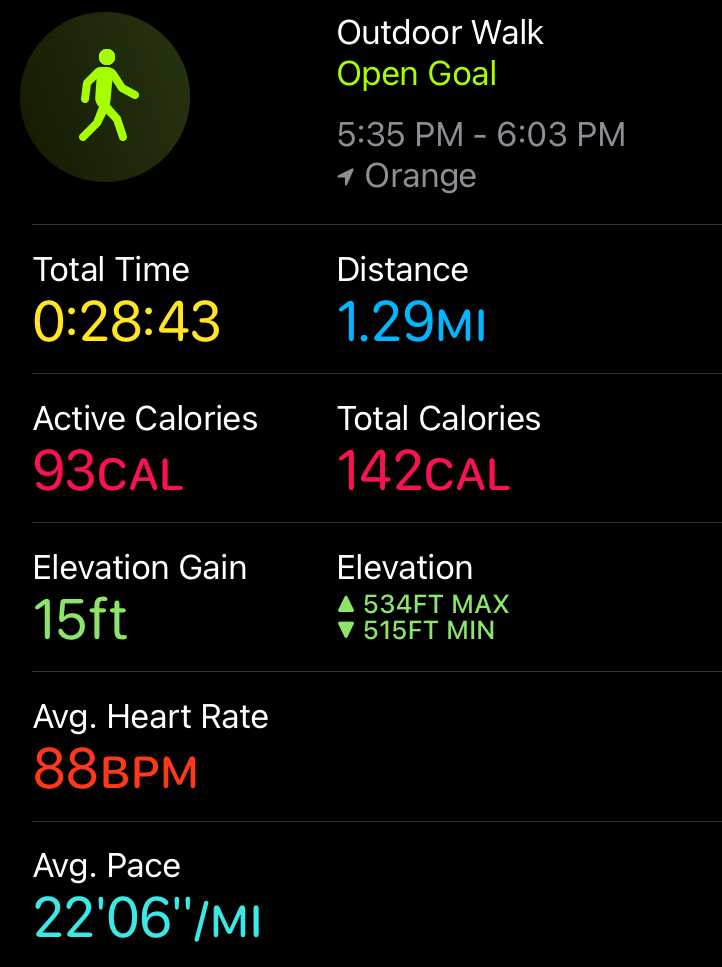 First walk using the Apple Watch as the tracker instead of the Fitbit (Charge 2). I hope it’s more accurate and reliable than the Fitbit since it cost a lot more. The workout data is transmitted to an app on the iPhone called Fitness. Here’s the data screen: