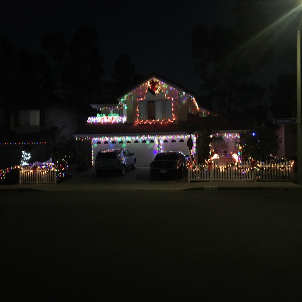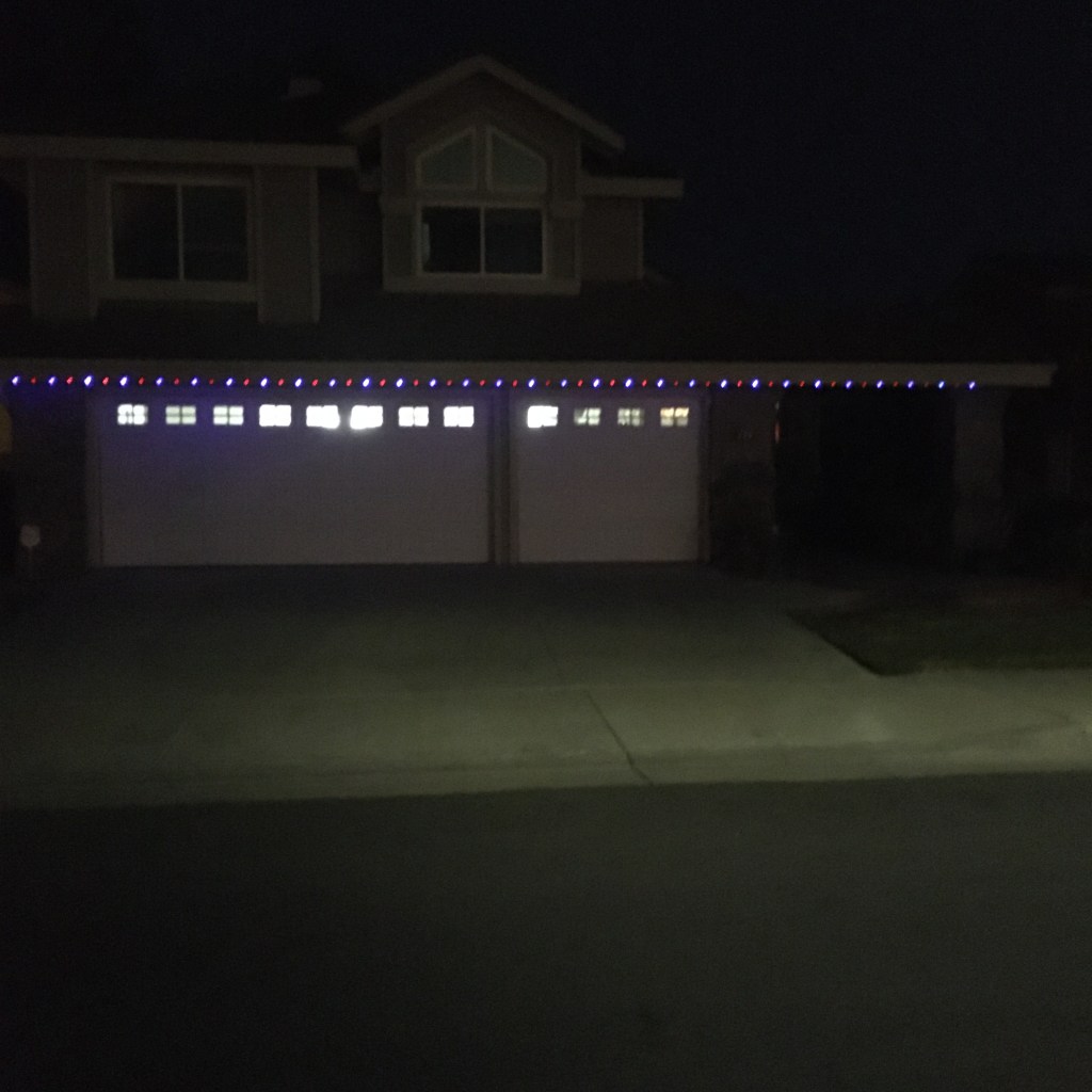 It’s not very impressive but it’s the first set up outdoor lights that we’ve put up for Christmas, ever. You can’t tell from the photo but the lights alternate colors and blink on and off. Not bad for our first attempt. I’m thinking I’ll just leave the LED light strip up all year, and only turn it on during December. Each year, I’ll spend another $20 and put up a new light strip on the house somewhere. Eventually we’ll go all out like our neighbor: