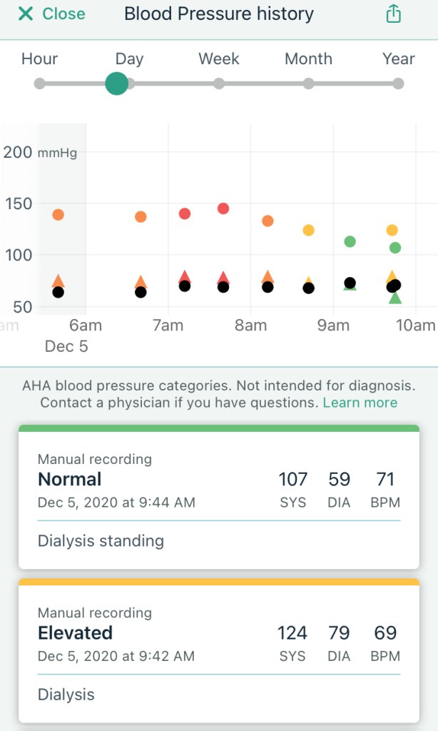 Since my right arm is pretty much immobilized during dialysis, I can’t really write or take notes. However, I do have a blood pressure app on my iPhone that’s used to download data from my BP cuff, and it allow you to make manual entries. So during dialysis, each time the machine took my blood pressure readings, I typed it into my phone. Here’s the report/chart for this morning: