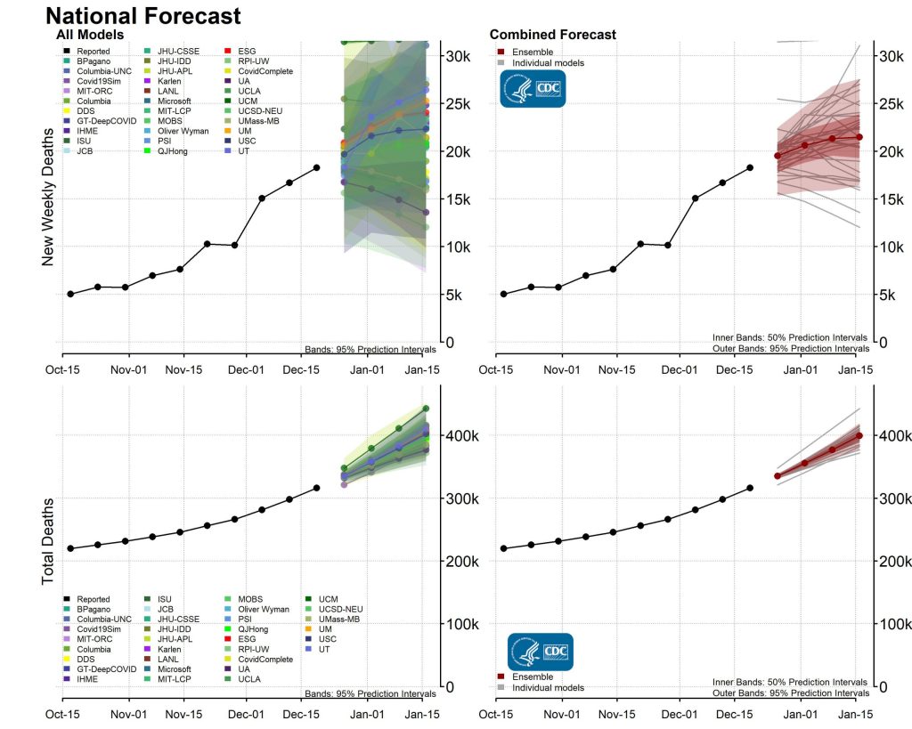 The worst part is that we’re not done yet. The number of cases and deaths will continue to climb since the Christmas and New Year spike is coming in January, and not enough people have been vaccinated yet. The CDC has a webpage for forecast models and it looks like we will hit 400,000 cases by the third week of January.