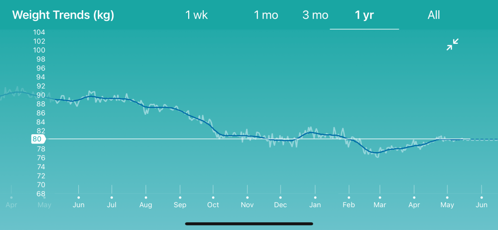 In the past 12 months, I have lost about 10 kg or ~22 pounds. For the past six months, my weight has been pretty steady at around 80 kg or between 175-180 pounds. Due to the higher blood sugar readings, I have been trying to eat less carbs and sugar so maybe that has helped keep the weight gain down. Since my right leg is still hurting a bit, I have not been walking that much. Not sure what that does to the weight however. I will have to start walking more soon though.