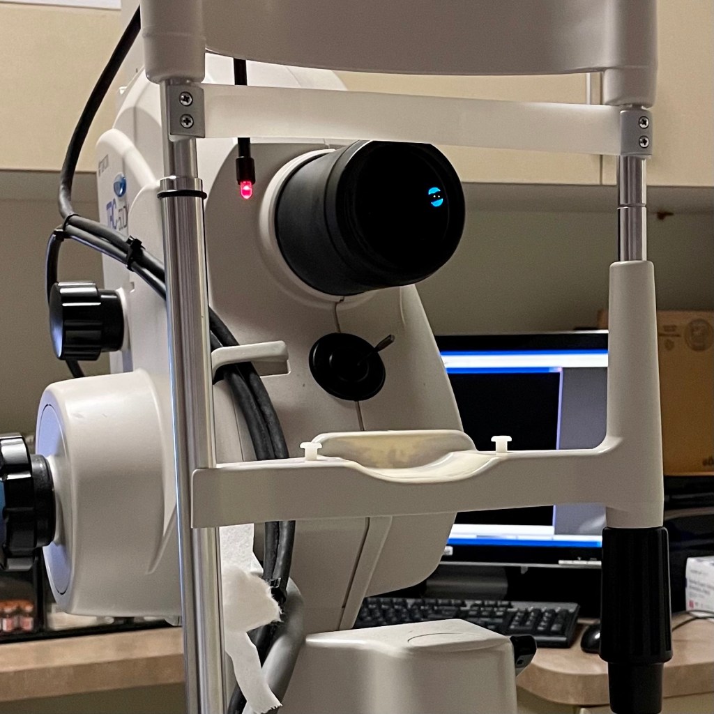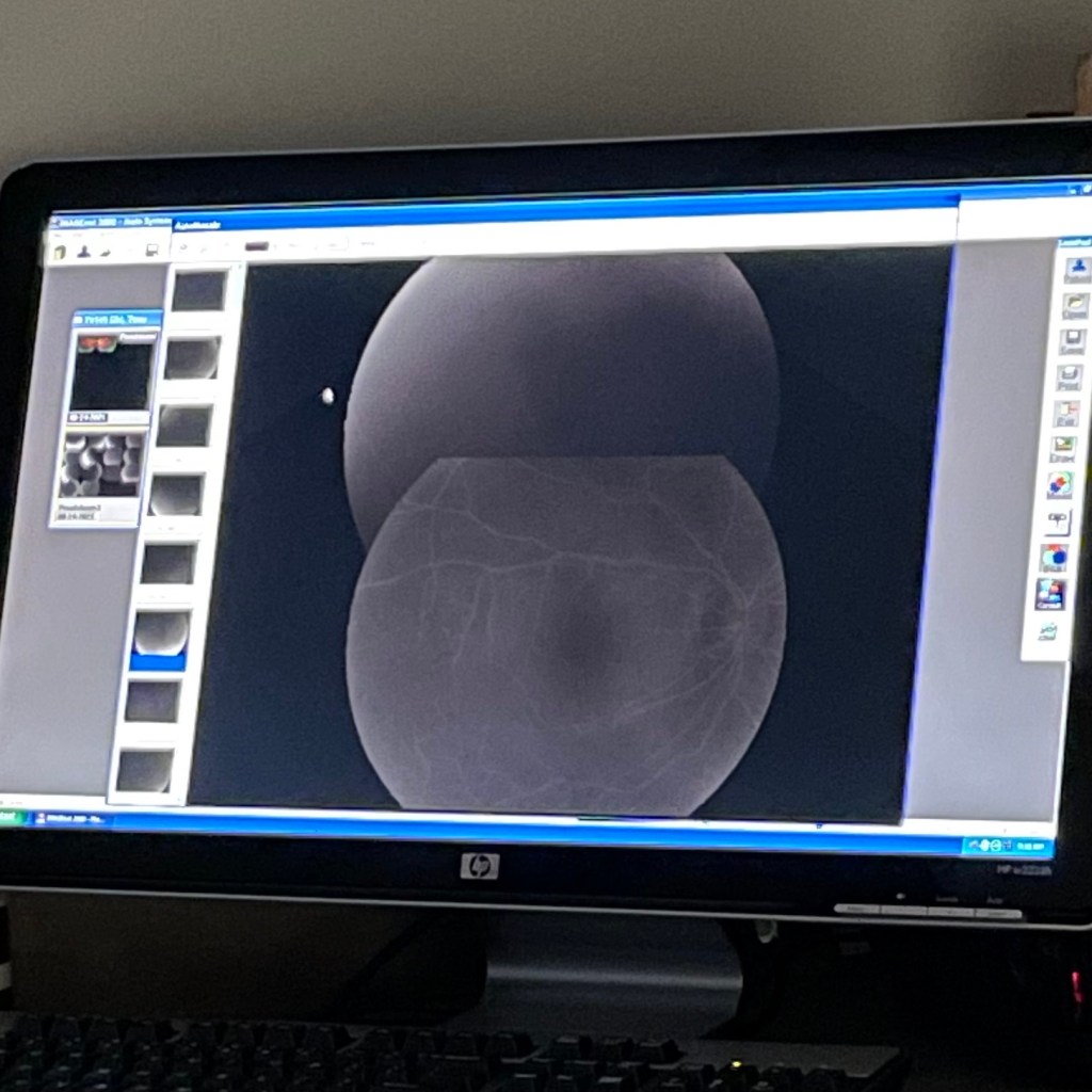 This was the camera that was used. First the technician dilated my eyes with eyedrops, then took a lot of photos using the above camera. The red LED was what I was supposed to look at, and he moved it around to orient my eyes properly. Next, the doctor came in to inject some dye into a vein, and then the technician took a bunch more photos. There was a flash on the camera to illuminate the back of your eyeball, but since I was dilated, it was super bright and I was mostly blinded after the first few photos.