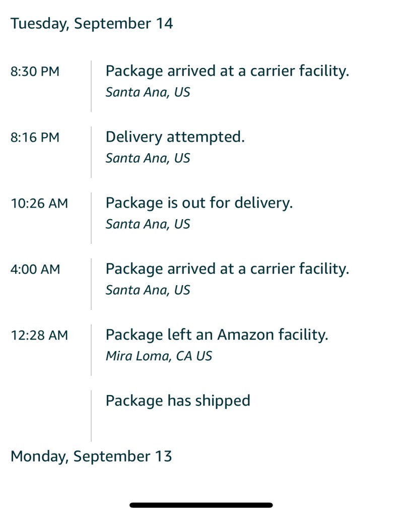 This is the third or fourth delivery failure from Amazon this year. It is pretty incredible that they can delivery my crap that quickly, but do not make promises you cannot keep. The tracking data also said the driver was back at the Santa Ana distribution center at 8:30 pm. That is pretty quick if there was a real delivery attempt at my house at 8:16 pm. My guess? My package did not even get put on the truck at 10:26 am, and was generically marked as a failed delivery at the end of the route. That is total bullshit. If the package did not get on the truck in the morning, then send me a message. In either case, the package is not coming, and I do not need to wait around all day for delivery. Instead, I get these useless delivery time updates , but nothing is delivered. It is dishonest and I think it gives their customer a worse experience.