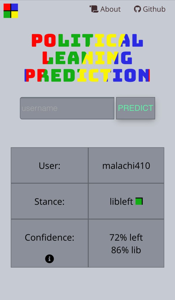 This result still has me as a libertarian but at 86%, it is more confident than TPC. However, the same analysis has grouped me as a liberal with 72% confidence. I am unsure which comments in my history pushed the analysis heavily to the left. I would love to understand the algorithm that make the determinations.