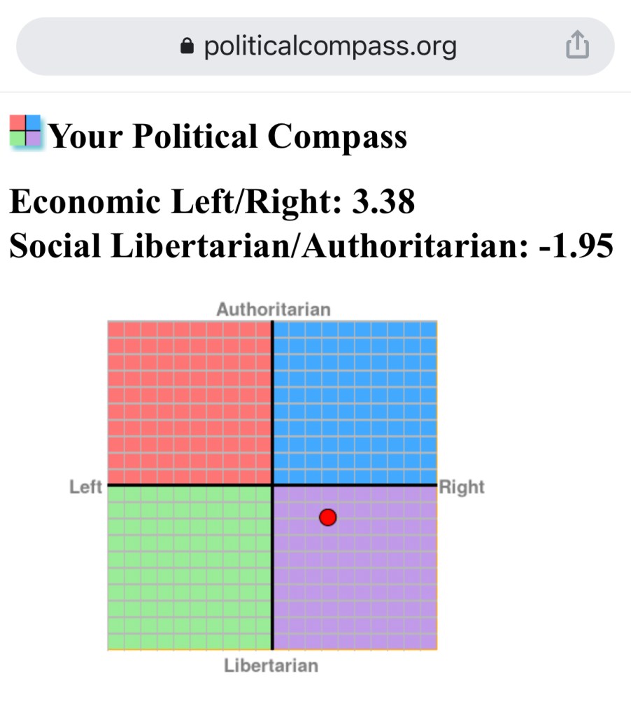 The results placed me pretty close to where I expected: I want the government to leave me alone, and I think my taxes are too high. There is another website that examines your Reddit comment history and an algorithm will evaluates you on the same axis.
