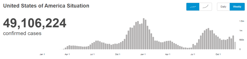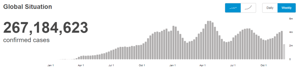 This is WHO data for the entire world. There are clear spikes from December 2020, April 2021, September 2021, and right now. For the US, the data is a bit different, but cases are also going up again.