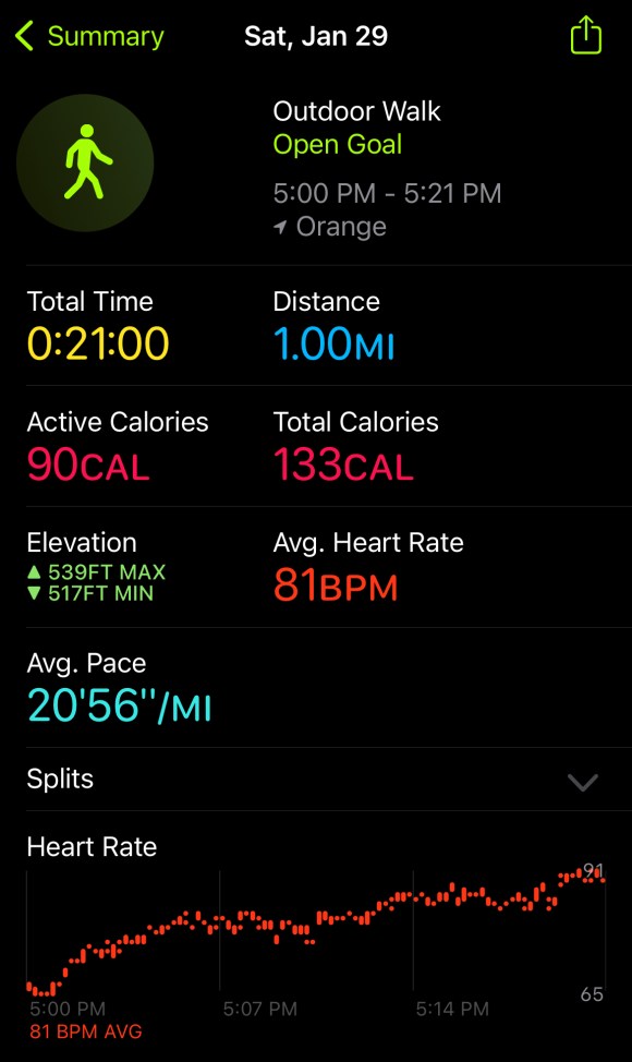 I finally went outside for a walk. It has been a long time since I walked outdoors instead of using the treadmill in the garage. It definitely felt much harder than before. My legs were numb and sore after the first few blocks, and I was running out of breath near the middle of the walk. I was surprised that the pace was fairly high (for me); it felt much slower during the walk. My heart rate also increased more than before where I would only hit low-80’s. This must be from all the recent weight gain, and not walking consistently for the past few months.