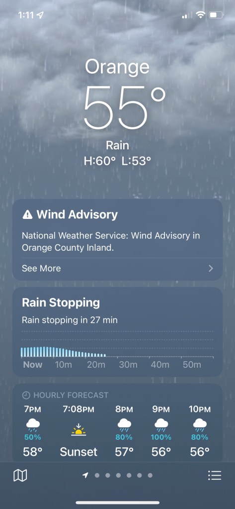 Since it never rains in Southern California and I rarely wash my car, I went downstairs and backed my car out of the garage and onto the driveway. Even though it is not a car wash, the rain will wash away some of the accumulated dirt and dust. My iPhone’s weather app says rain will stop in about half an hour, but it should rain more tonight.