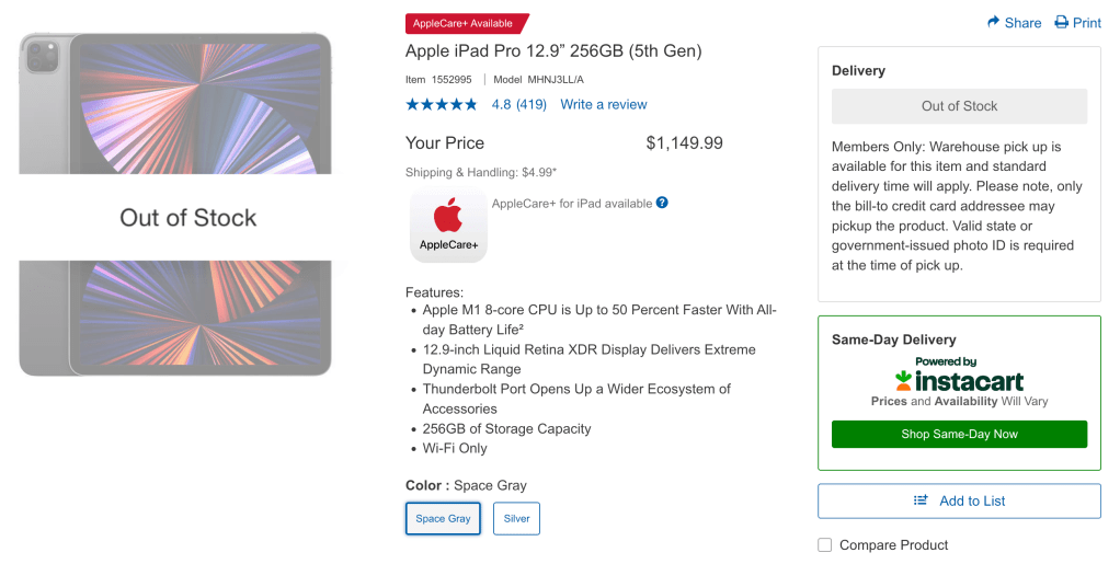 The “Out of Stock” is for online purchase and delivery. It may be available in the warehouse stores so I can go check after work today. I am hesitant since I have spent a lot of money on Apple hardware. This will be the third iPad Pro I purchase since I bought one each for my mom and dad before.