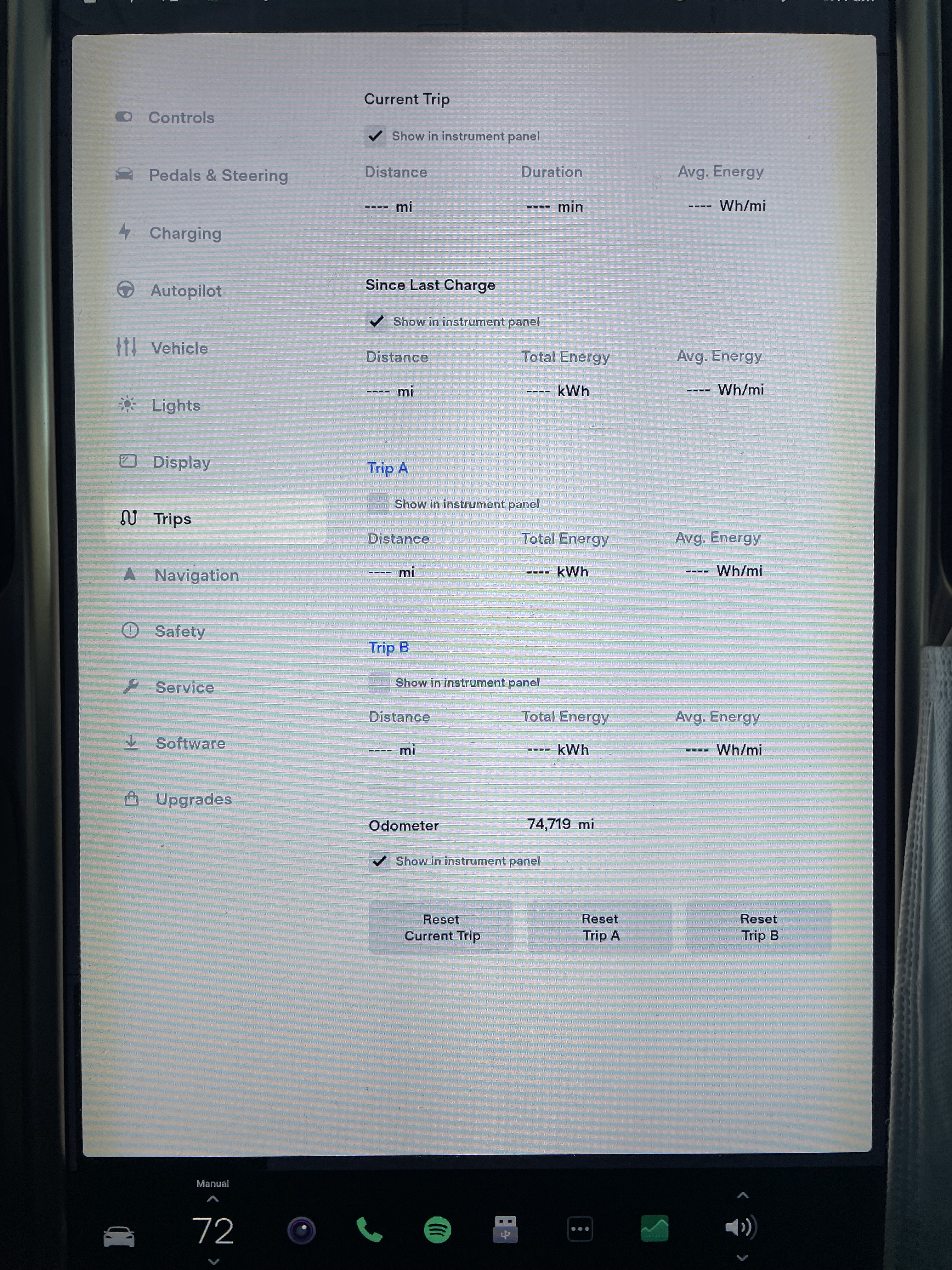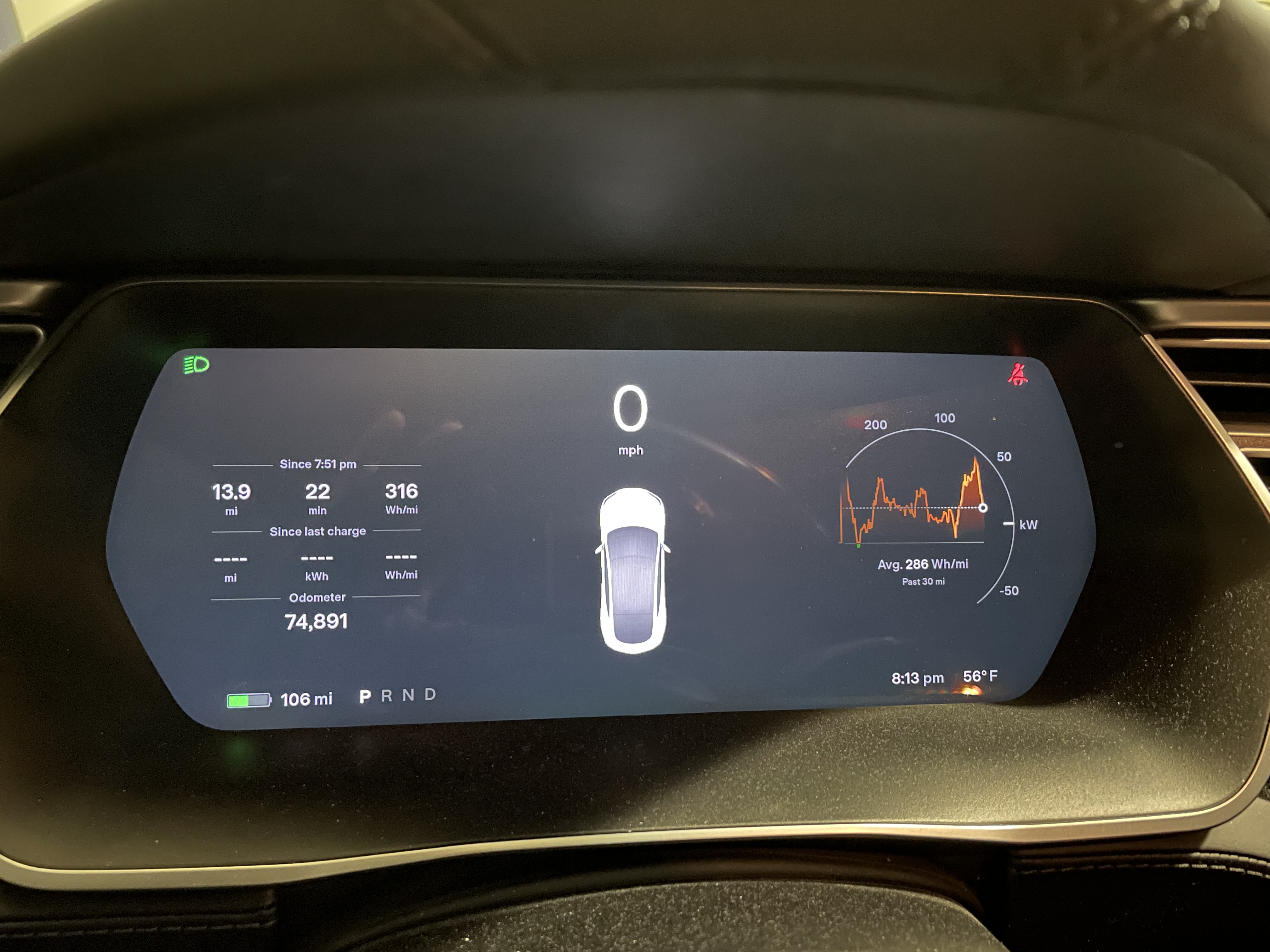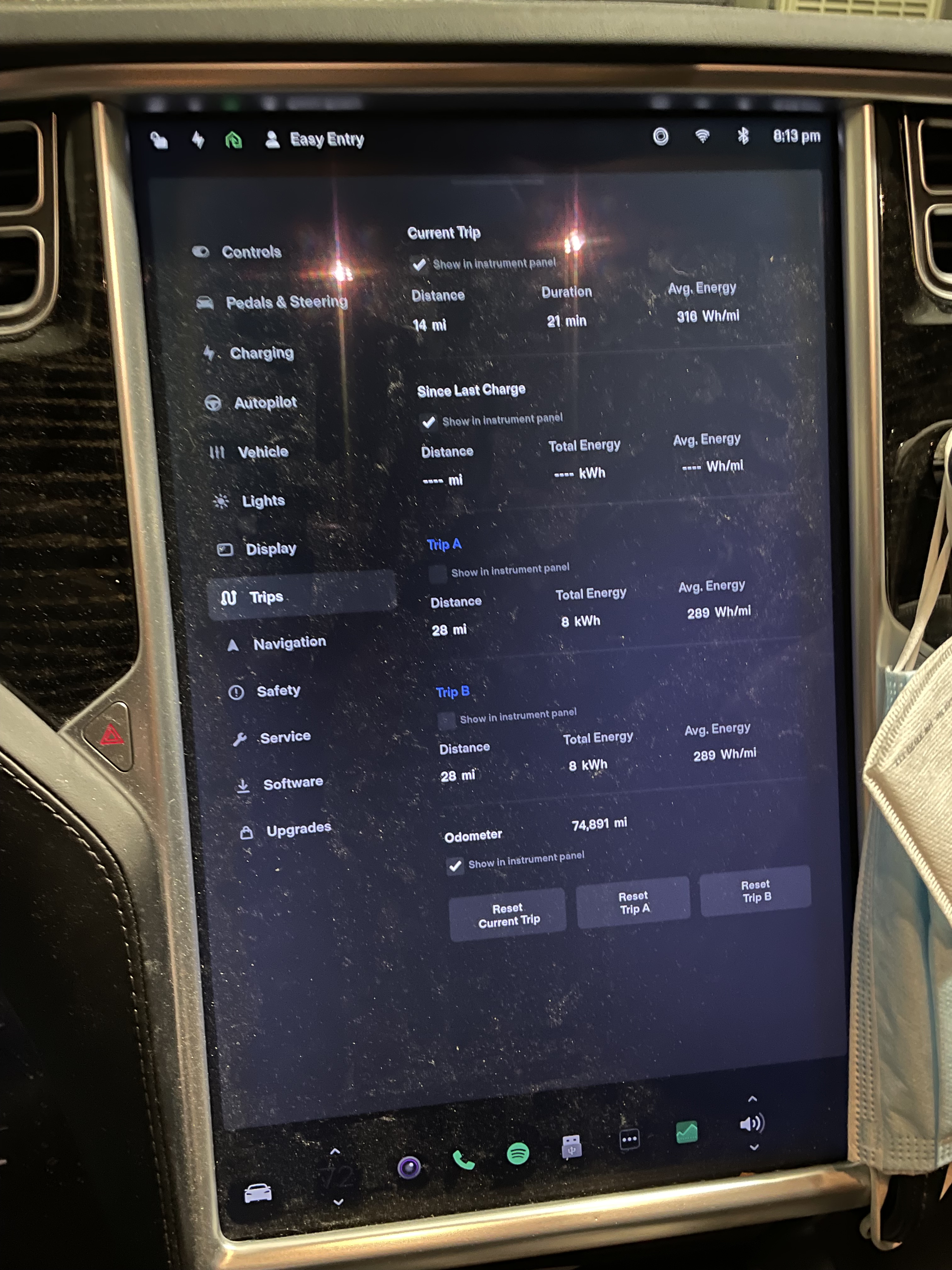 A strange thing happened to my Tesla this week. When I got in the car to drive to work Thursday morning, I noticed the energy meter was blank. Since it usually shows energy usage for the past thirty miles, the display is never blank. I then checked the trip data display, and it was showing zeros too. I have never reset the trip counter before.