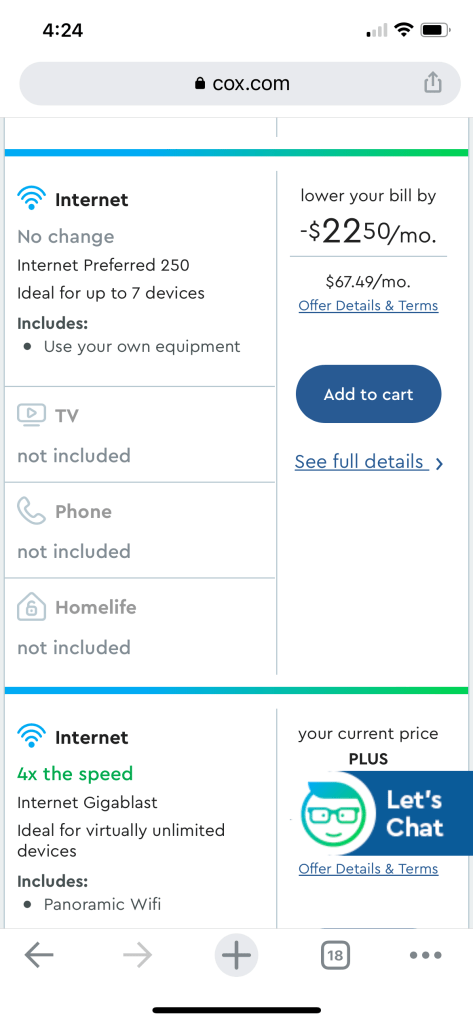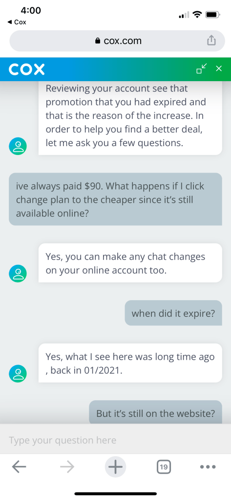 Instead of just clicking, I clicked on the chat option. The chatbot was useless for my question so I asked for an agent. Hearing that it was a pricing question, the first agent quickly passed me to the loyalty department. That is double-speak for “trying to keep you as a customer” department. Anyway, long story short, the loyalty agent claims the offer I saw expired in January 2021, yet was still on the customer website. At least that is what I concluded since his chat answers were not always relevant or coherent. After a few exchanges, I gave up. I did go online to check, and the non-introductory rate is $90/month. Cox must use a pretty persistent tracking cookie since I had to turn off Wi-Fi on my iPhone and use Safari to get “new customer” pricing.