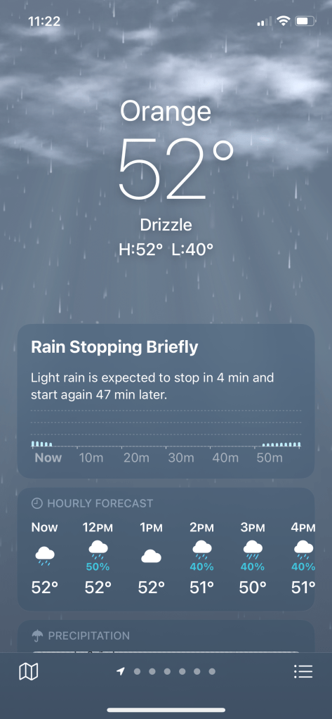 I typically rely on the iPhone weather app, but it is not really accurate. The app shows that it is currently raining and will stop soon. I looked outside and my driveway was completely dry. Maybe the app is showing me weather at the nearest weather station nearby?
