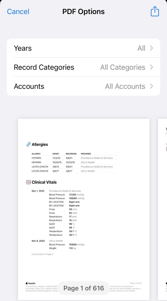 I reconnected all my health providers to Apple Health again this morning. I think the connections are time-limited, so you need to reauthorize access periodically. It took a long time to update. I also noticed an “export to PDF” option so I let my iPhone generate the report for all lab results from everywhere for all time. The result was a 616-page PDF. 😱