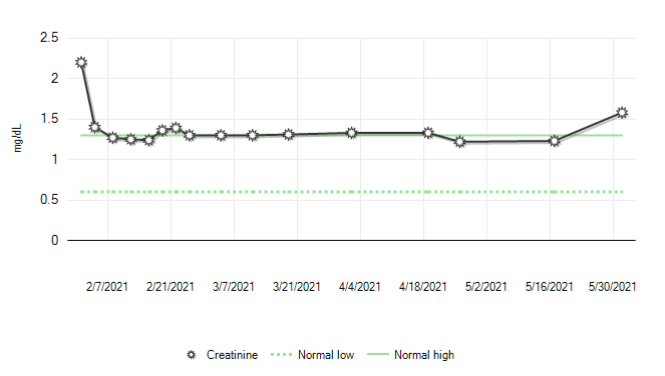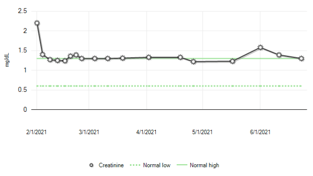Since the transplants, I have had minor issues with lab results, primarily potassium (too high), calcium (also too high), phosphorus (too low), and blood sugar (way too high). However, the creatinine levels were pretty solid, though on the high end of normal. Here is a chart pre-transplant: