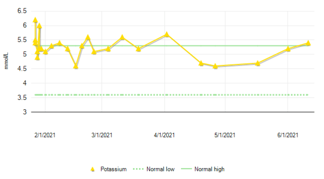 The issue this time is high hemoglobin combined with high potassium. My potassium has been borderline high since transplant, and this time, the result was 5.4 mmol/L: