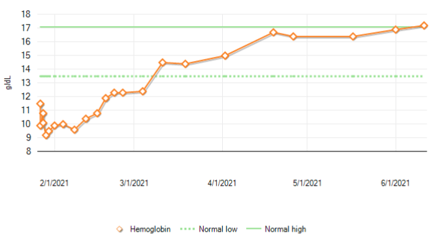 The hemoglobin results post-surgery were super low since I had anemia while on dialysis, but it has steadily increased until it is now borderline high. High hemoglobin can lead to blood clots that may end up in the lungs causing pulmonary embolism, or the brain causing a stroke. Great!