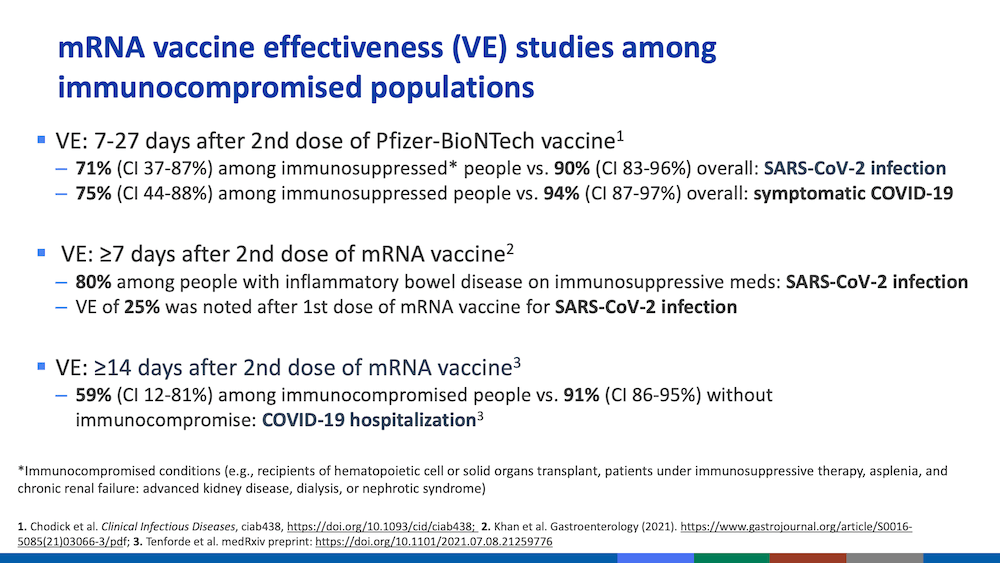 This one is a bit confusing because I think they are combining data from several categories. It does appear that vaccine effectiveness (VE) is lower in IP than in the general population: 75% vs. 90% for infections, 71% vs. 94% for symptomatic cases, and 59% vs. 91% for hospitalization. Some of the non-mRNA vaccines (Sinovac, Sinopharm) are around this level of VE anyway so maybe it’s not that bad?