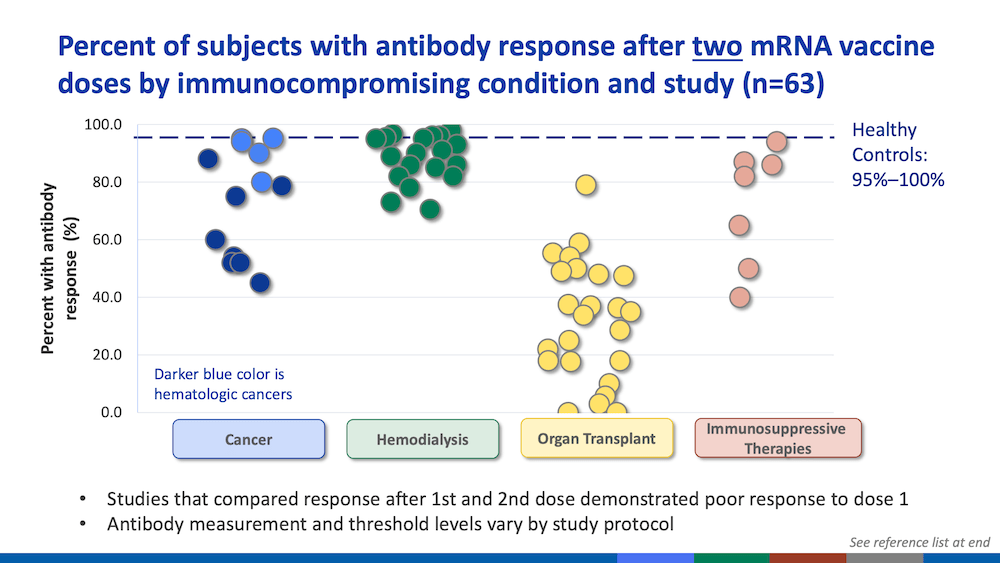 This is a small sample size (n=63), but it seems that organ transplant recipients have the worse antibody response out of all the IP categories. I was on hemodialysis for several years, and was categorized as a high-risk for infection at the beginning of the pandemic. However, it is probably due to cardiovascular and respiratory issues rather than the immune system. So the response to the vaccine should be fairly normal, but once infected, symptoms will likely be more serious.