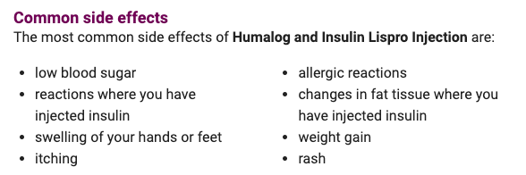 Even now, after twenty minutes and only four units, my back is still burning, and I feel a bit out of breath. I looked online and found some conflicting information. Some sites said Humalog can cause chills and sweating, but the official website listed sweating as a secondary side effect of hypoglycemia. Here is what is listed as common side effects: