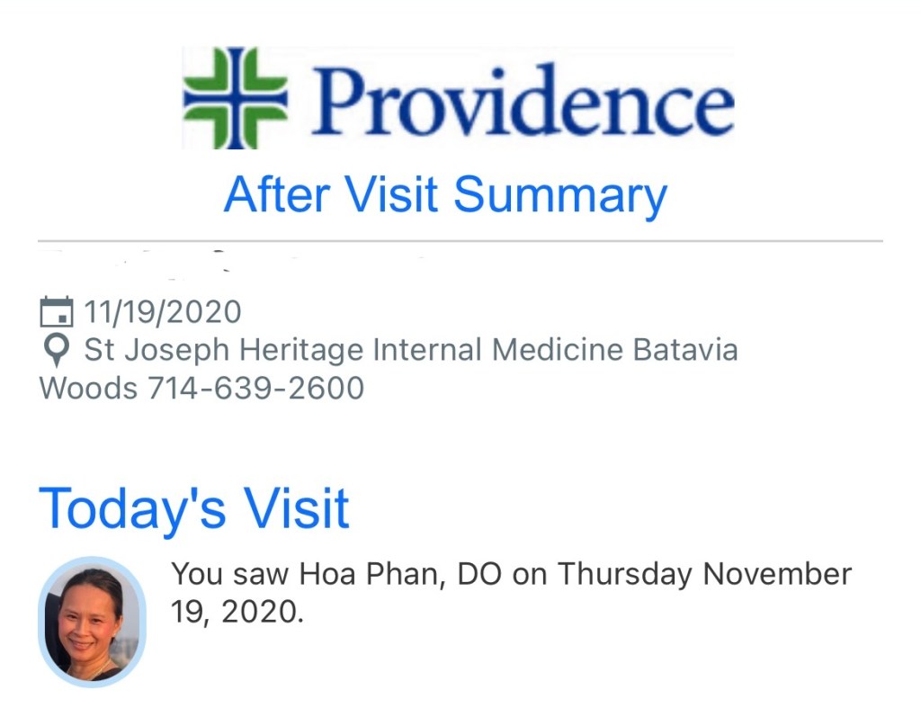 I just called the family practice clinic, and they cannot locate the last doctor I saw there. I have been going to that office for many years but back in 2018 or 2019, my doctor retired. I was then assigned to another family medicine doctor, Dr. Hoa Phan, and I did see her once in November 2020. Since it was during COVID, it was a video call. I even have proof from the Providence MyChart app: