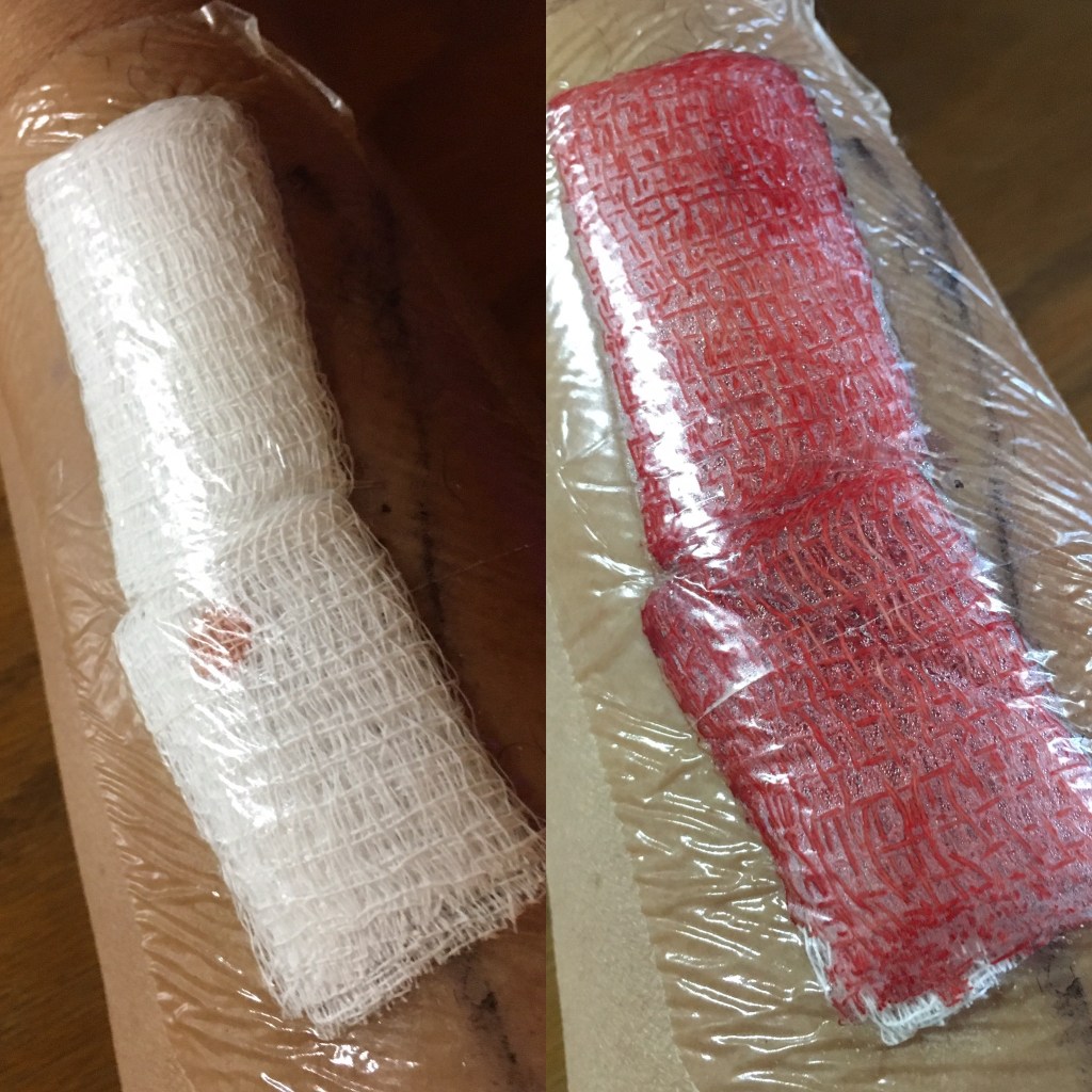It’s now bleeding through the fresh gauze I put over the incision. I think typing is flexing the muscles in my forearm and making the bleeding worse. I’ll take a break from blogging for now.