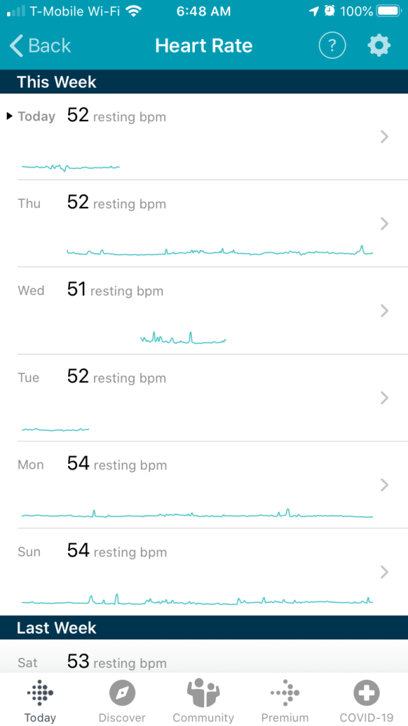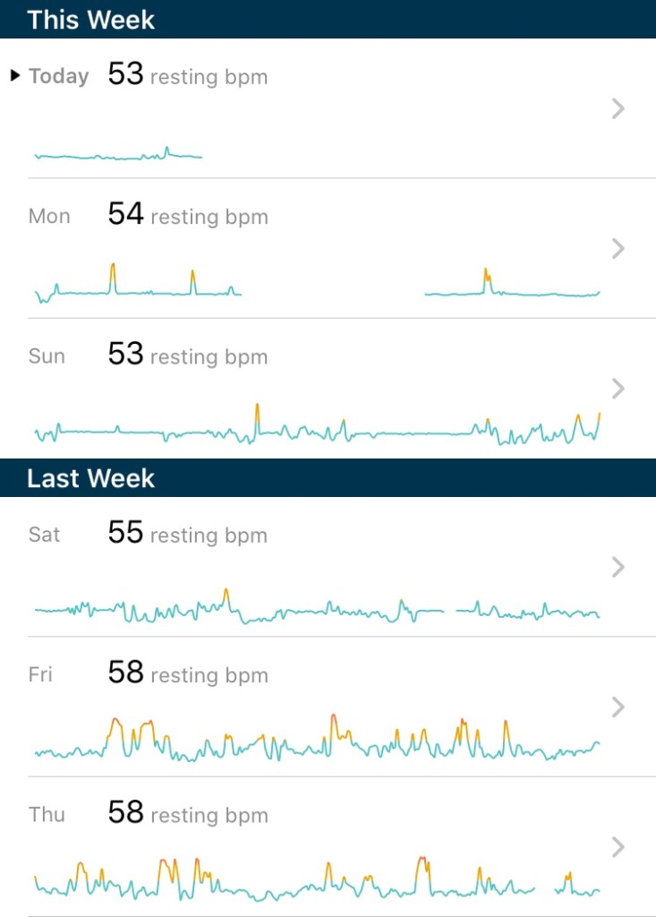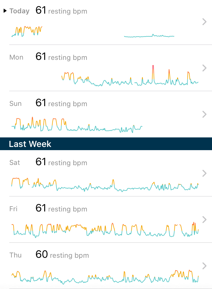 It started in the 60’s after heart surgery but slowed to the mid-50’s when I started taking Terbinafine, which can react with Metoprolol and cause a slower heart rate. The increase in April was from the initial a-fib, which was not fixed by cardioversion. The huge spike in May was the a-fib re-occurrence and waiting for the cardiac ablation procedure on June 5th. It has steadily dropped since then to the low 50’s. Here is this weeks heart rate readings; the gaps are when I was charging the Fitbit.