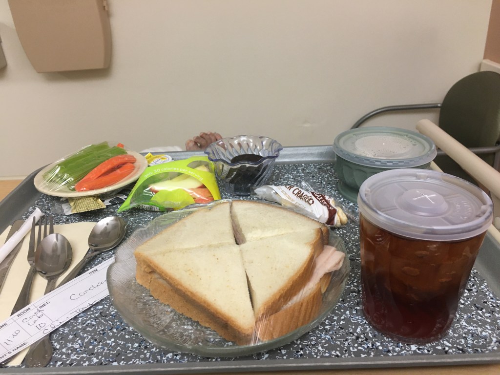 I guess they used some heavy duty anesthesia since they keep telling me not to sit up. My back is killing me. It’s almost noon now and a nurse brought me some lunch. It’s basically a turkey sandwich and chicken noodle soup.