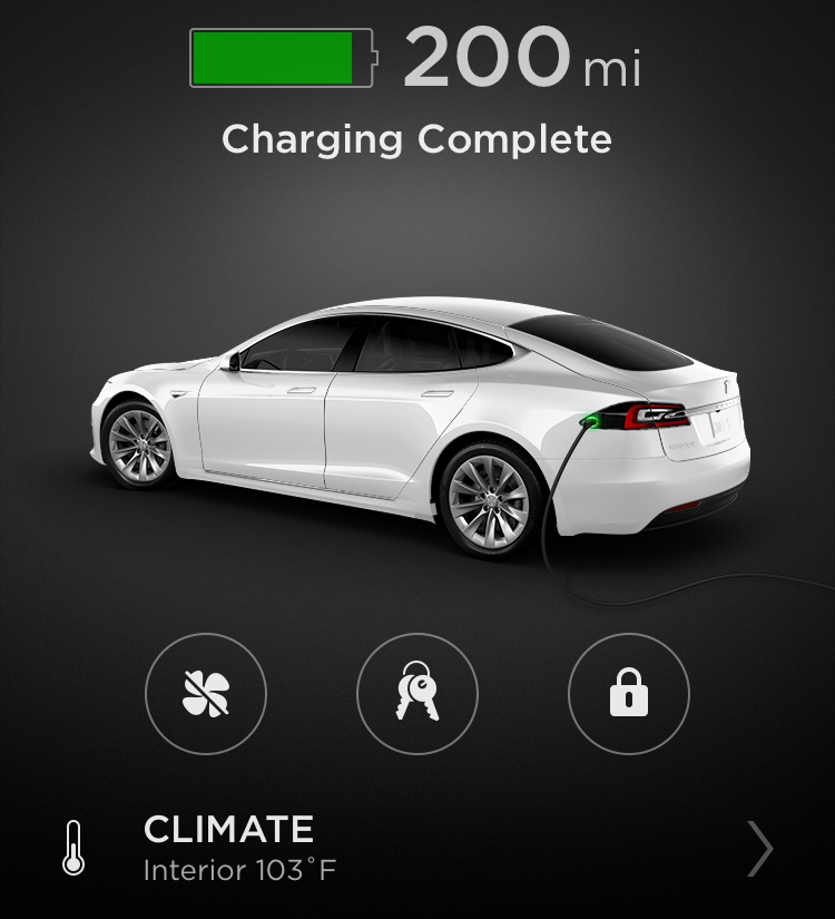 I can see the status of my car using an app on my phone. Usually if you park out in the open and it’s hot and sunny, you can turn on the air conditioning a few minutes before you go to the car, and it will be nice and cool. The car also limits the temperature to 103-104 degrees so it will kick in automatically when the interior temperature gets beyond that. The car is currently parked inside a parking structure, shaded from the sun. It should not be that hot inside the car unless the ambient temperature outside is that hot.