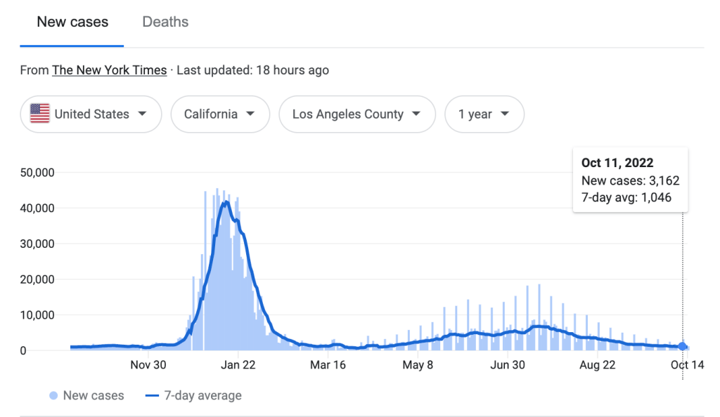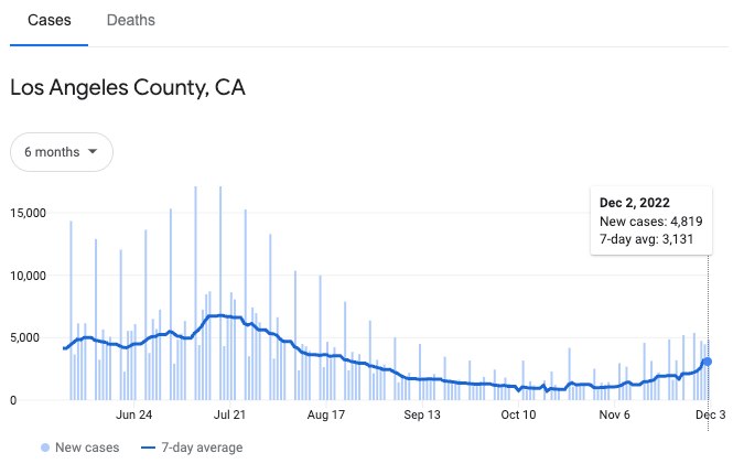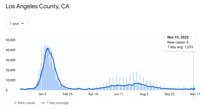 This is also visible from the case count history. Here is the past twelve months in Los Angeles County: