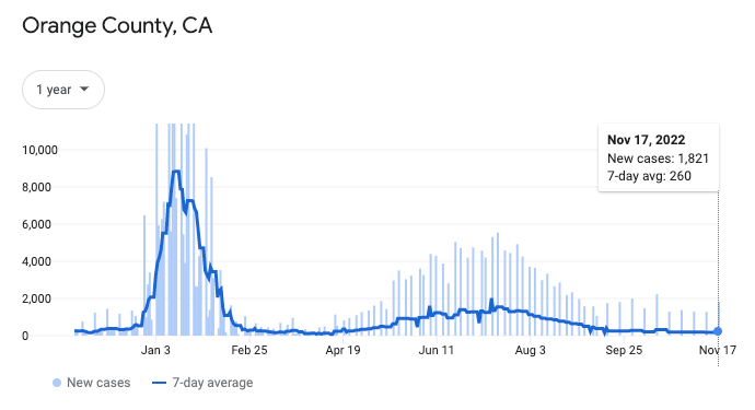 I did not think I would write another post about COVID-19, yet here we are again. I have not heard much news about COVID after China imploded from the sudden end to their zero-COVID policy. However, it does look like there is a slight increase in cases in the US. Here is Orange County data for new cases: